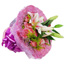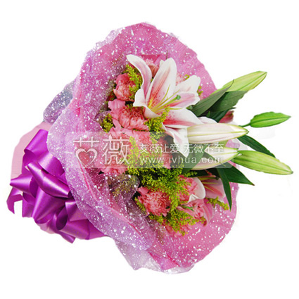 19枝粉康乃馨,2枝多头粉香水百合,黄莺点缀 |