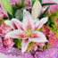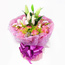 19枝粉康乃馨+2枝多头粉香水百合+粉色雪纱内衬+外用瓦愣纸圆形包装 |