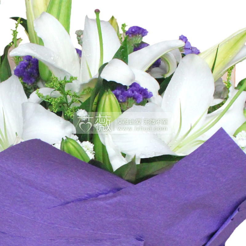 6枝多头白香水百合,搭配满天星,勿忘我 |