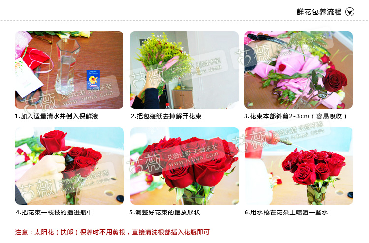 (2)及时放入花瓶,及时加水,入瓶前要剪茎(45度角的切面)以帮助花茎吸收水分。