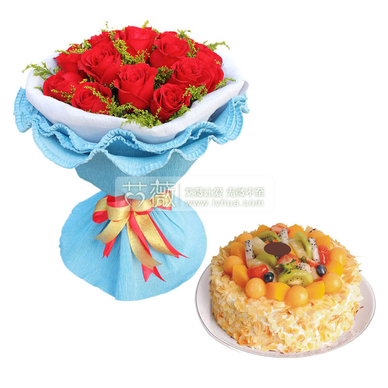 19枝红玫瑰,搭配黄莺;8寸蛋糕 |