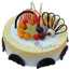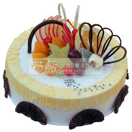 圆形鲜奶水果蛋糕,橙色奶油流苏,时令水果装饰,巧克力围边 |