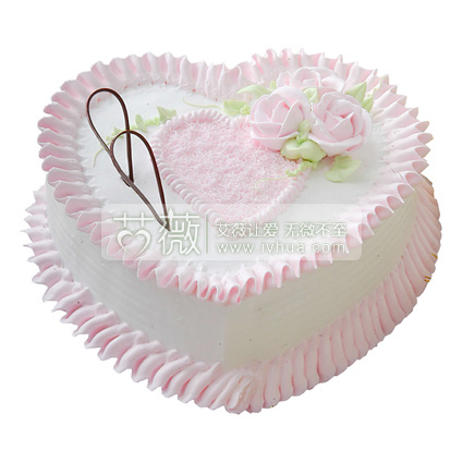 [材    料]: 心形鲜奶蛋糕,粉色鲜奶玫瑰花、巧克力片装饰