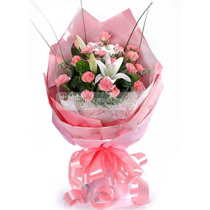 19枝粉康乃馨,3枝多头白香水百合,绿叶点缀 |