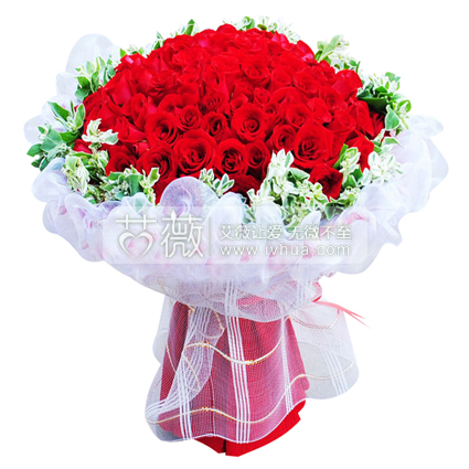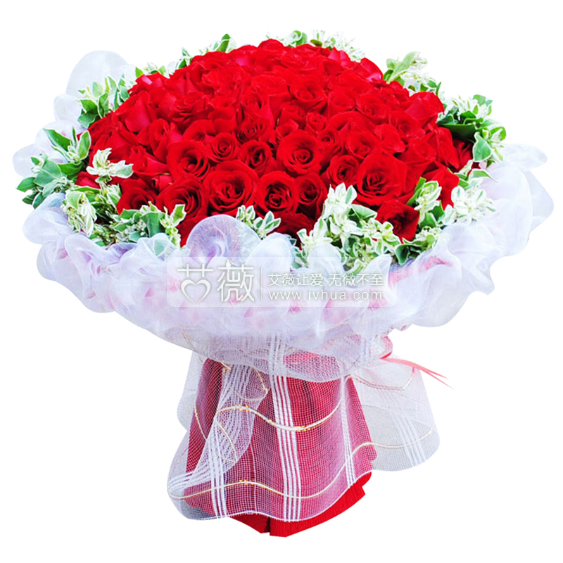 99枝红玫瑰,叶上花围边 |