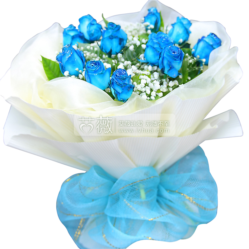 11枝蓝玫瑰,绿叶、满天星点缀 |