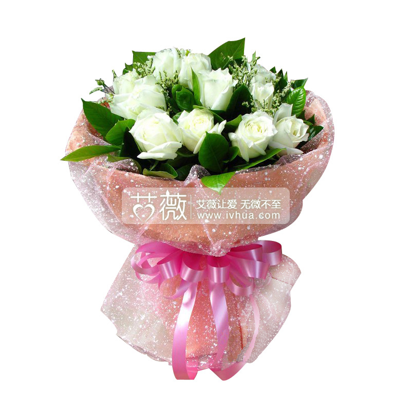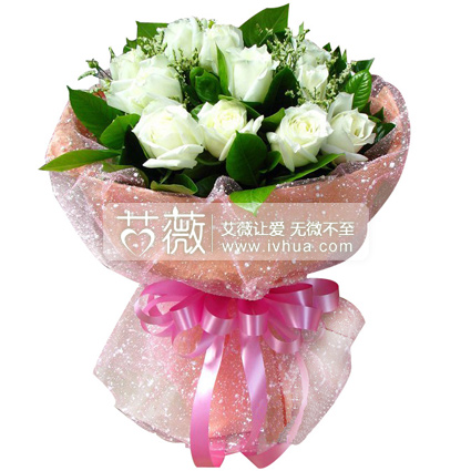 19枝白玫瑰,水晶草、绿叶丰满 |
