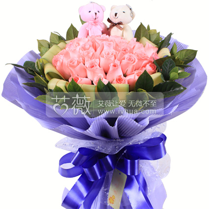精心挑选33枝粉玫瑰,巴西木叶和栀子叶外围,可爱小熊搭配,美丽动人 |